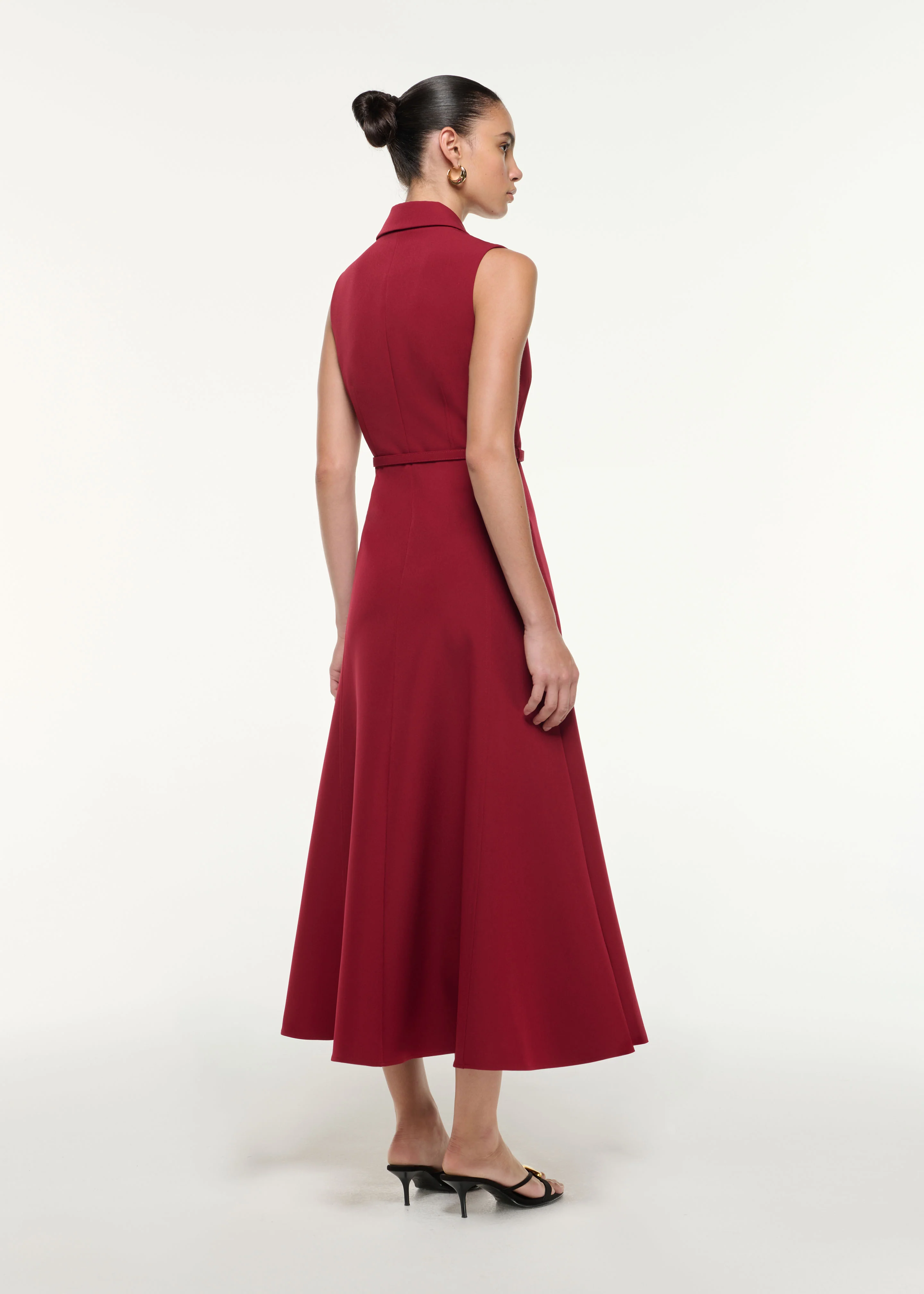 Light crepe sleeveless shirt style midi dress in dark red. Featuring an open collar shirt with concealed button fastening at the front and side seam pockets.