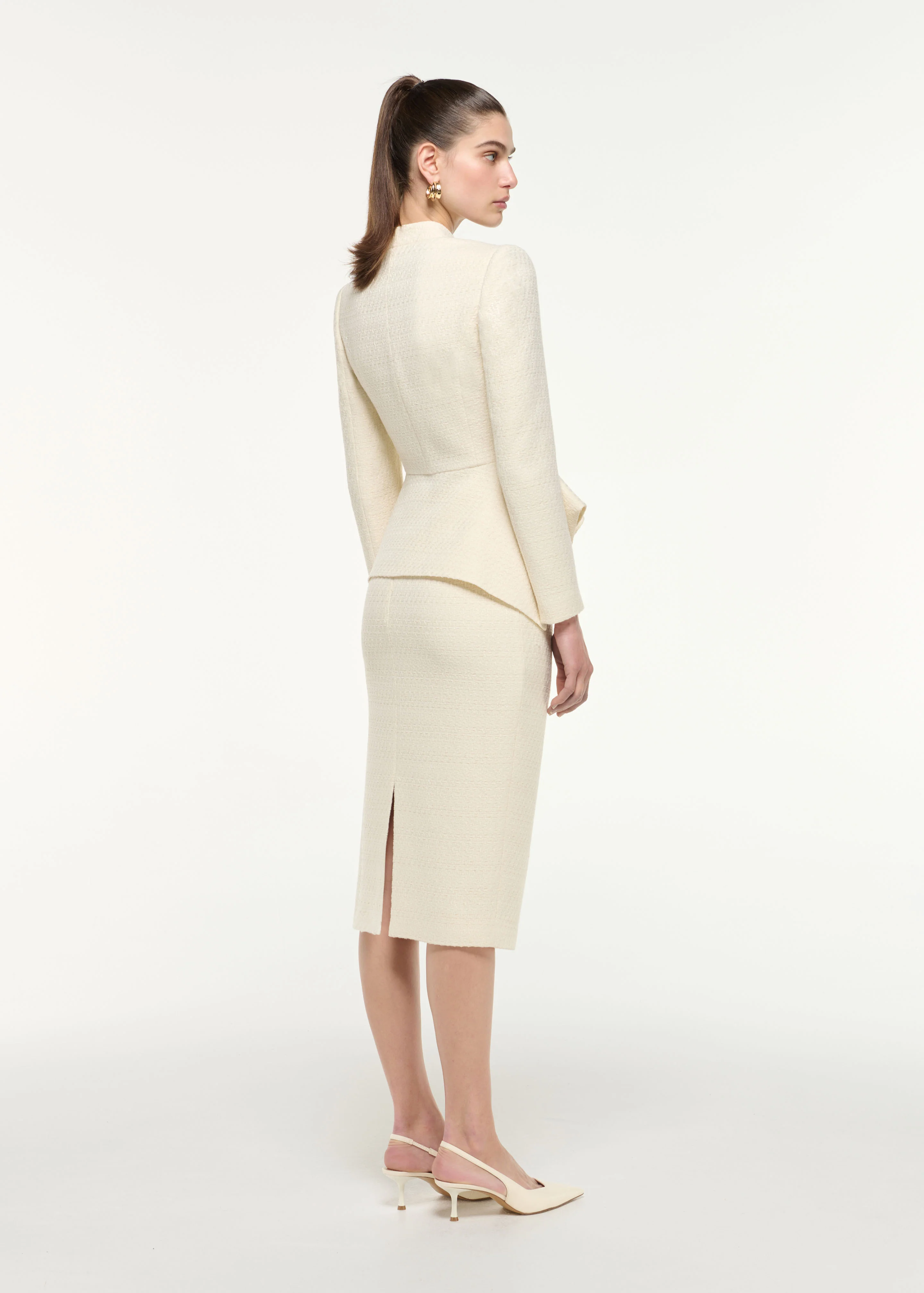 Slim fitted pencil shape midi skirt in cream coloured soft bouclé fabric with a slit at the back. Pair with our boucle peplum jacket to complete the look.