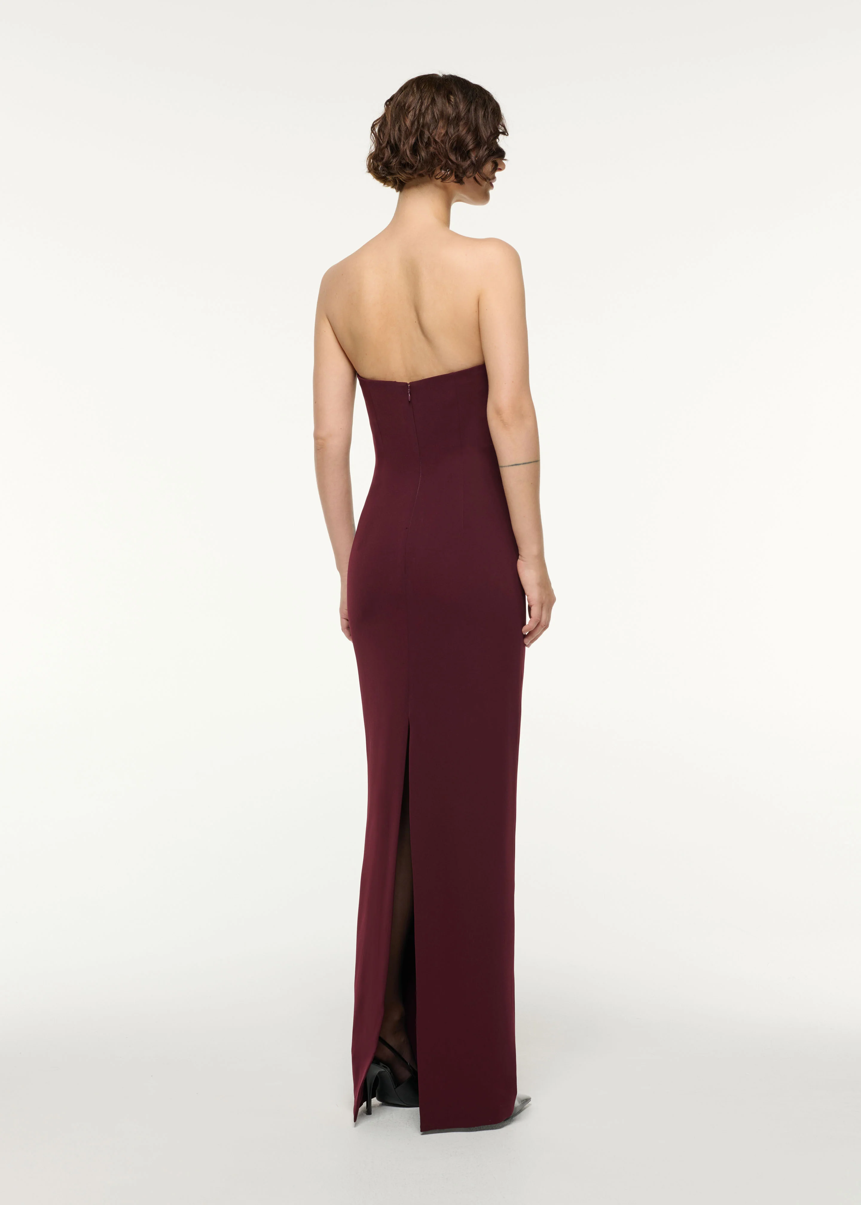 Contrast diamante peek-a-boo bust cups with a draped cady bodice and a column floor length skirt in a deep mulberry colour.