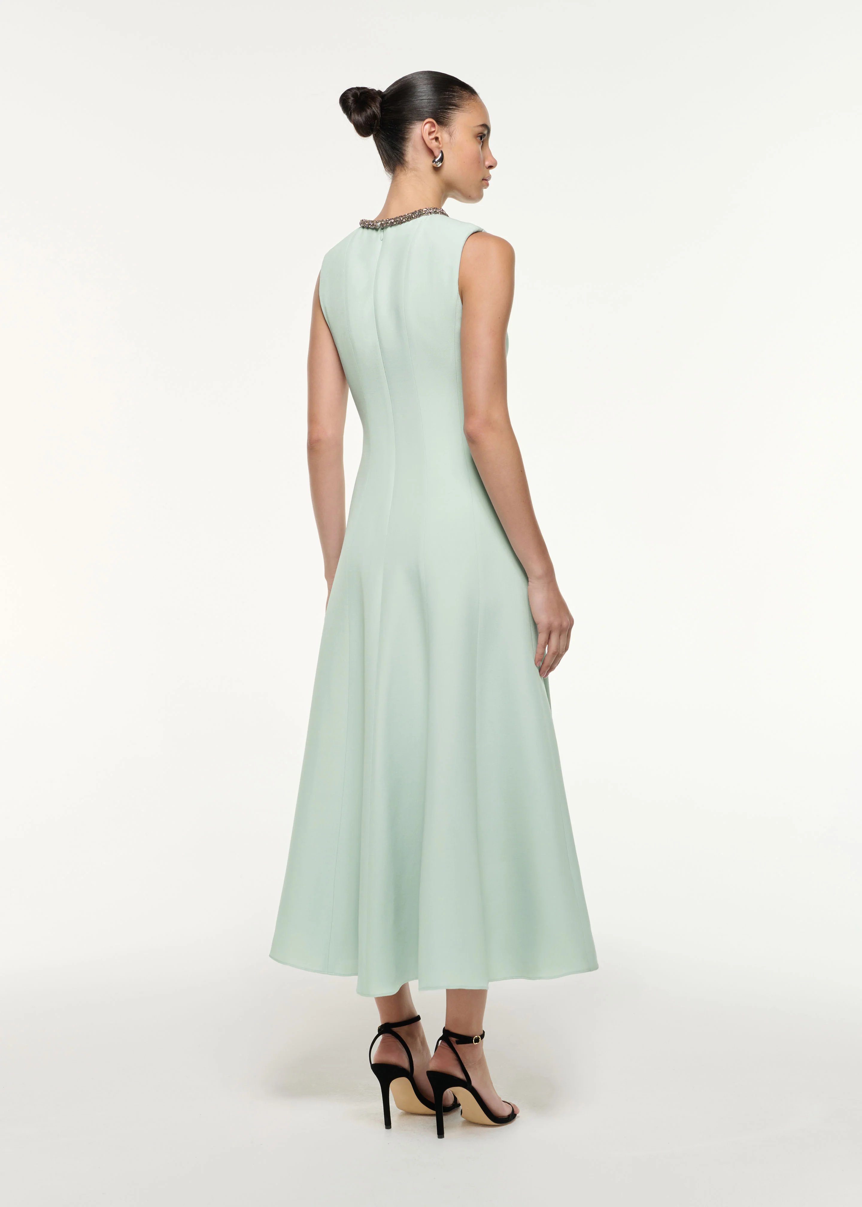 Sleeveless midi dress with rolled diamante embellished neckline. Made with dense wool silk fabric, the dress is fitted at the top and flares from the waist seam.