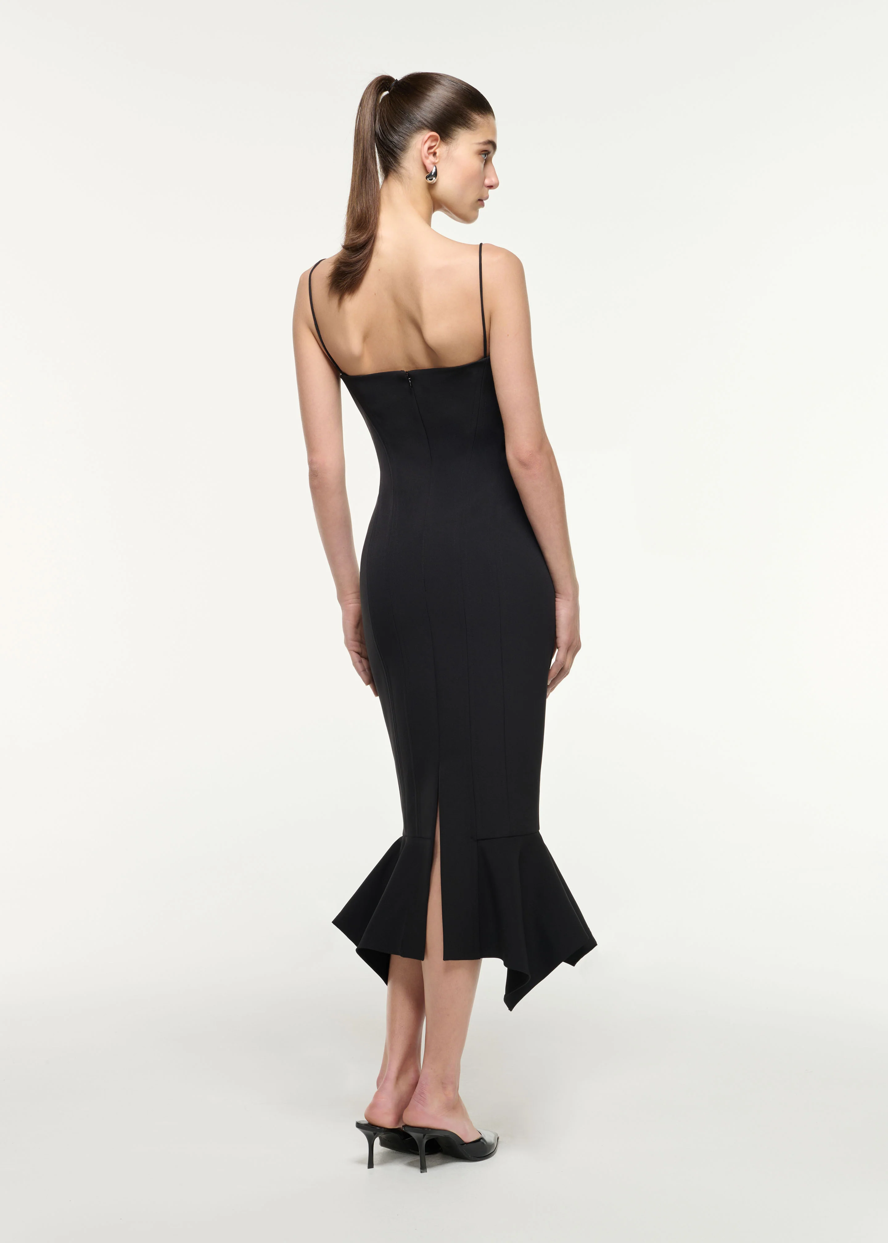 Black light crepe panelled dress with fishtail hem. Constructed from multiple narrow panels for structured shaping, this dress features spaghetti shoulder straps and an elegant frilled hem.