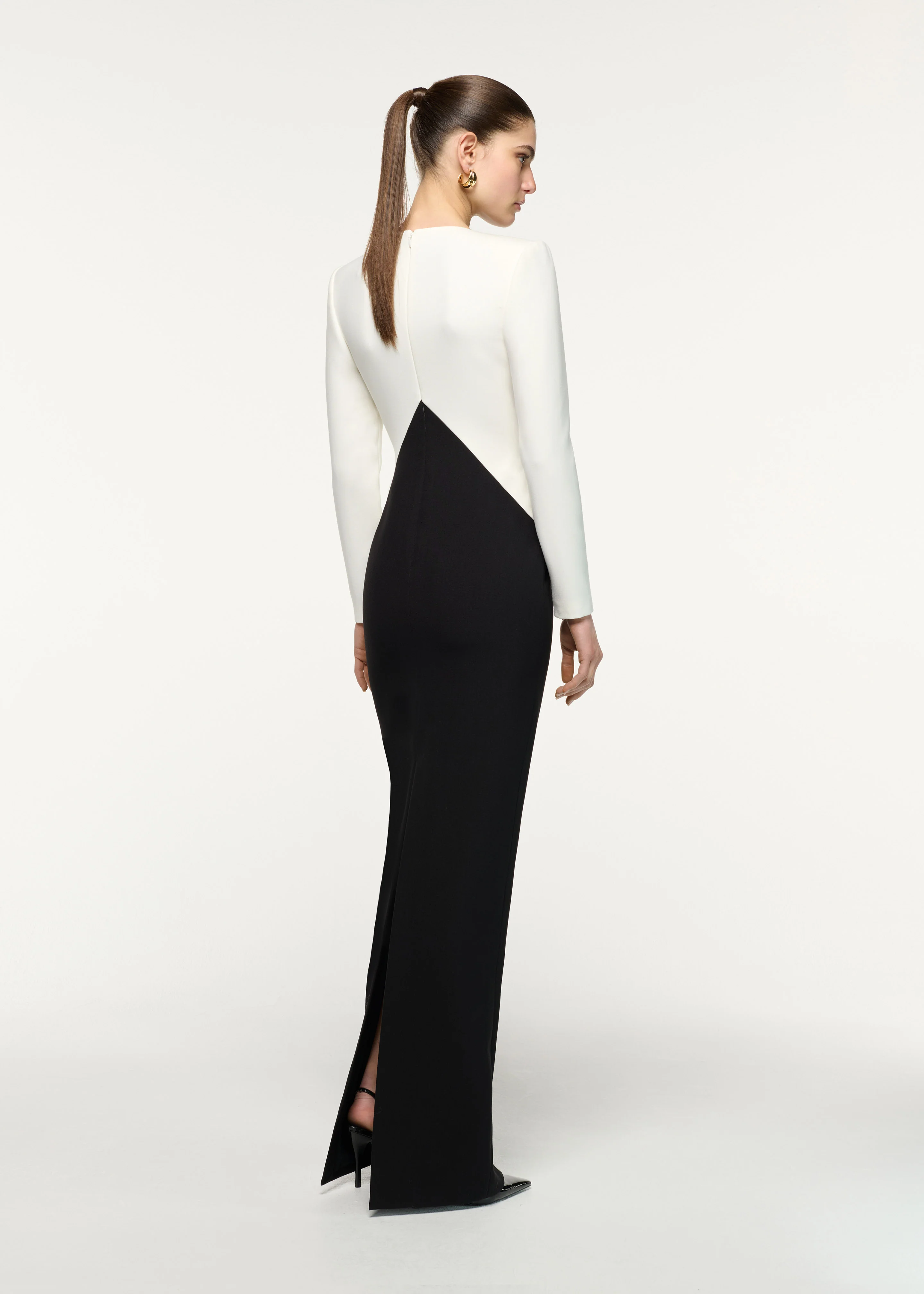 Dramatic dualities shape this long-sleeve column gown, crafted from black and white crepe. 3D rose appliqué adds visual drama, heightening the striking monochromatic contrast.