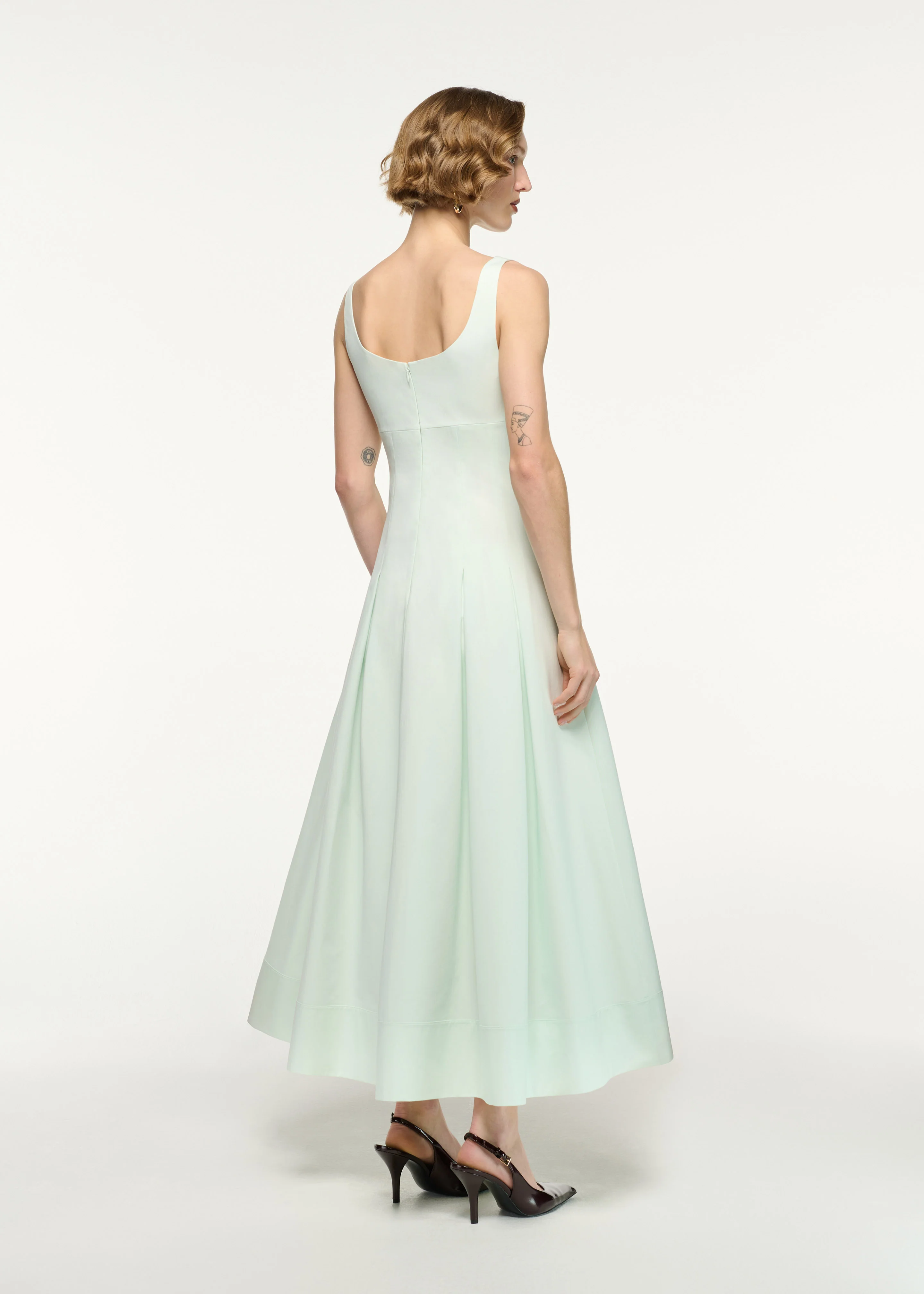 Softly radiant, this pastel mint dress exudes luminous flair. Seam-panelled detailing and a flowing full skirt define the silhouette with elegant movement.