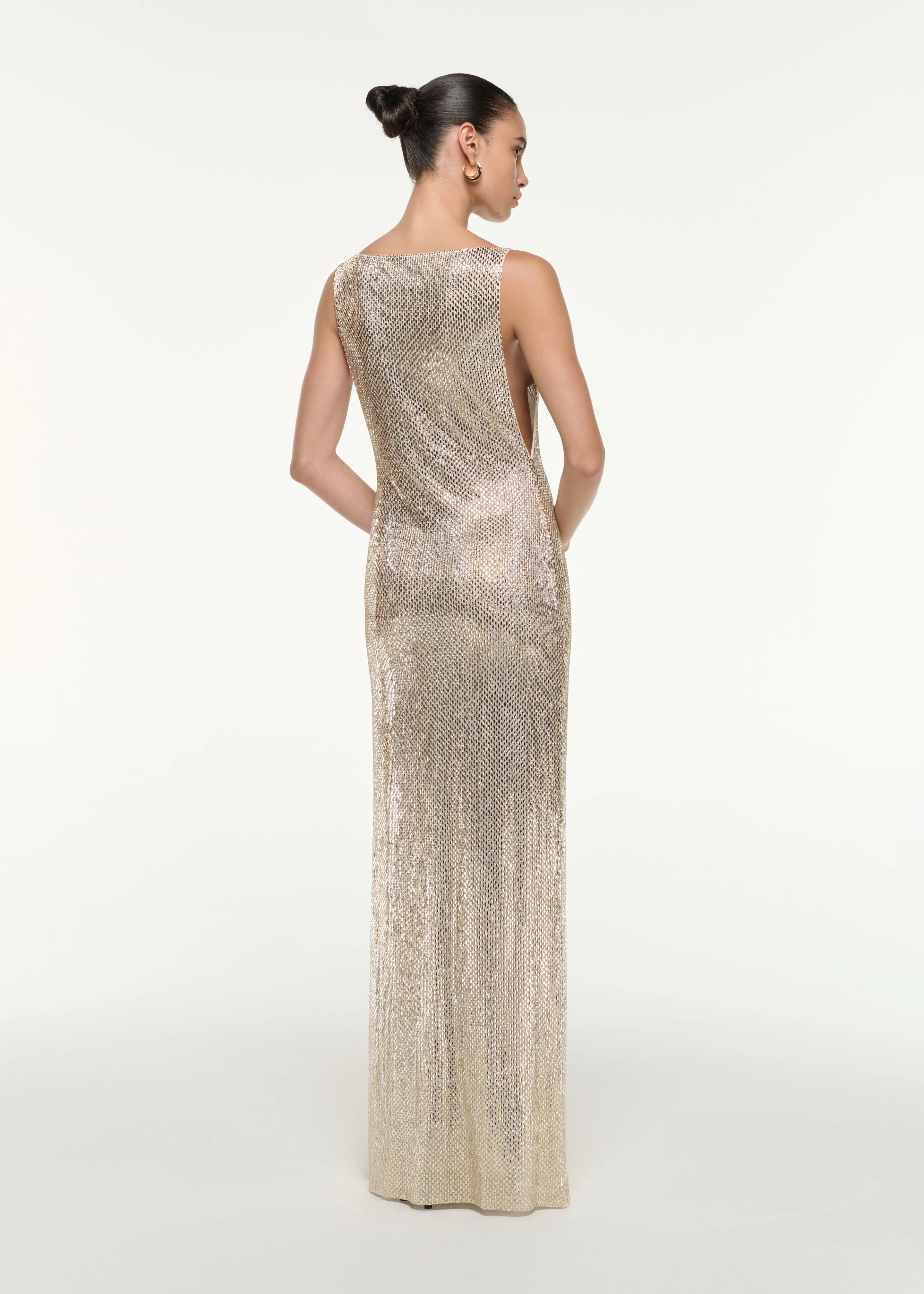 Statement sleeveless gown with all over thousands of tiny diamante embellishment in rich champagne colour, catching and reflecting the light beautifully with every movement.