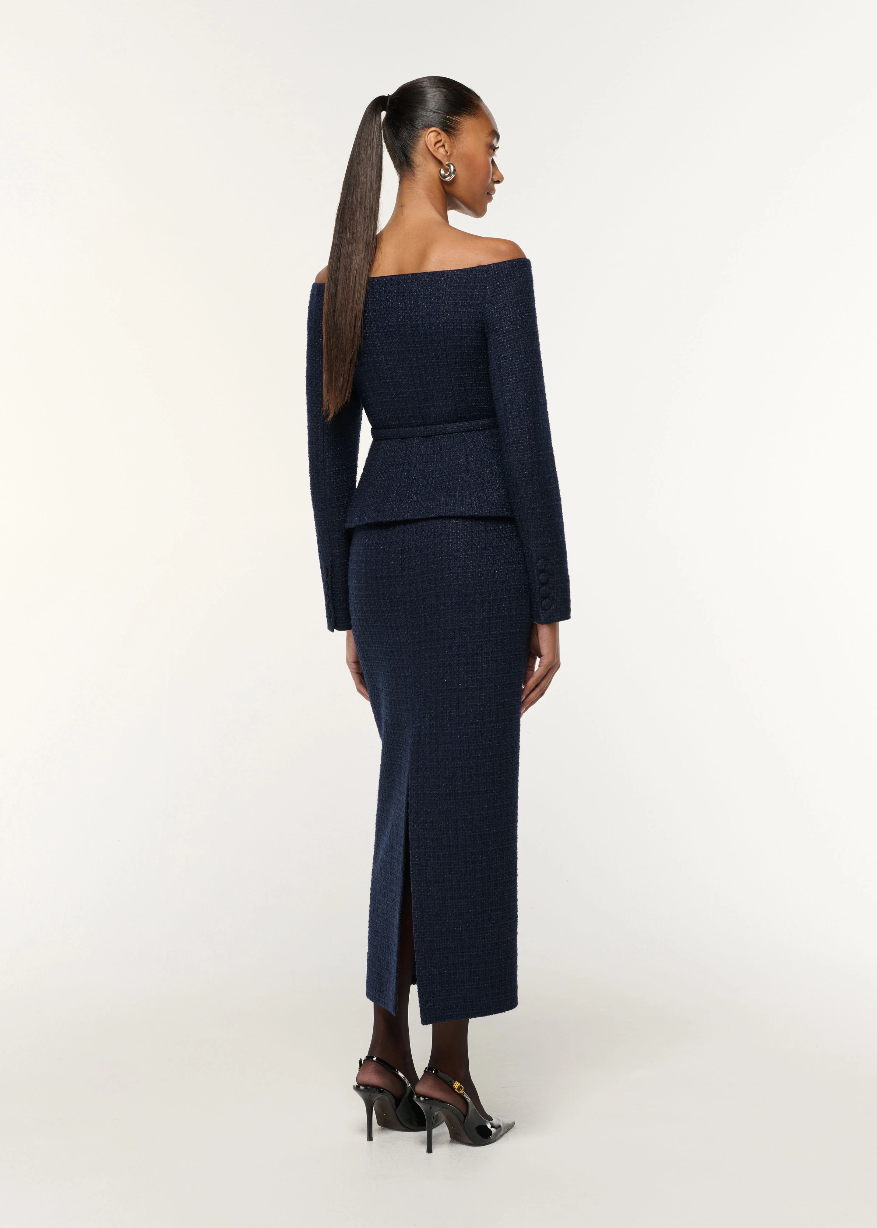A fresh perspective on evening tailoring, this navy bouclé top stuns with its sweeping off-shoulder neckline. A fabric belt and buttons accentuate its form-fitting silhouette. Pair with our matching boucle skirt for a stylish ensemble.Â