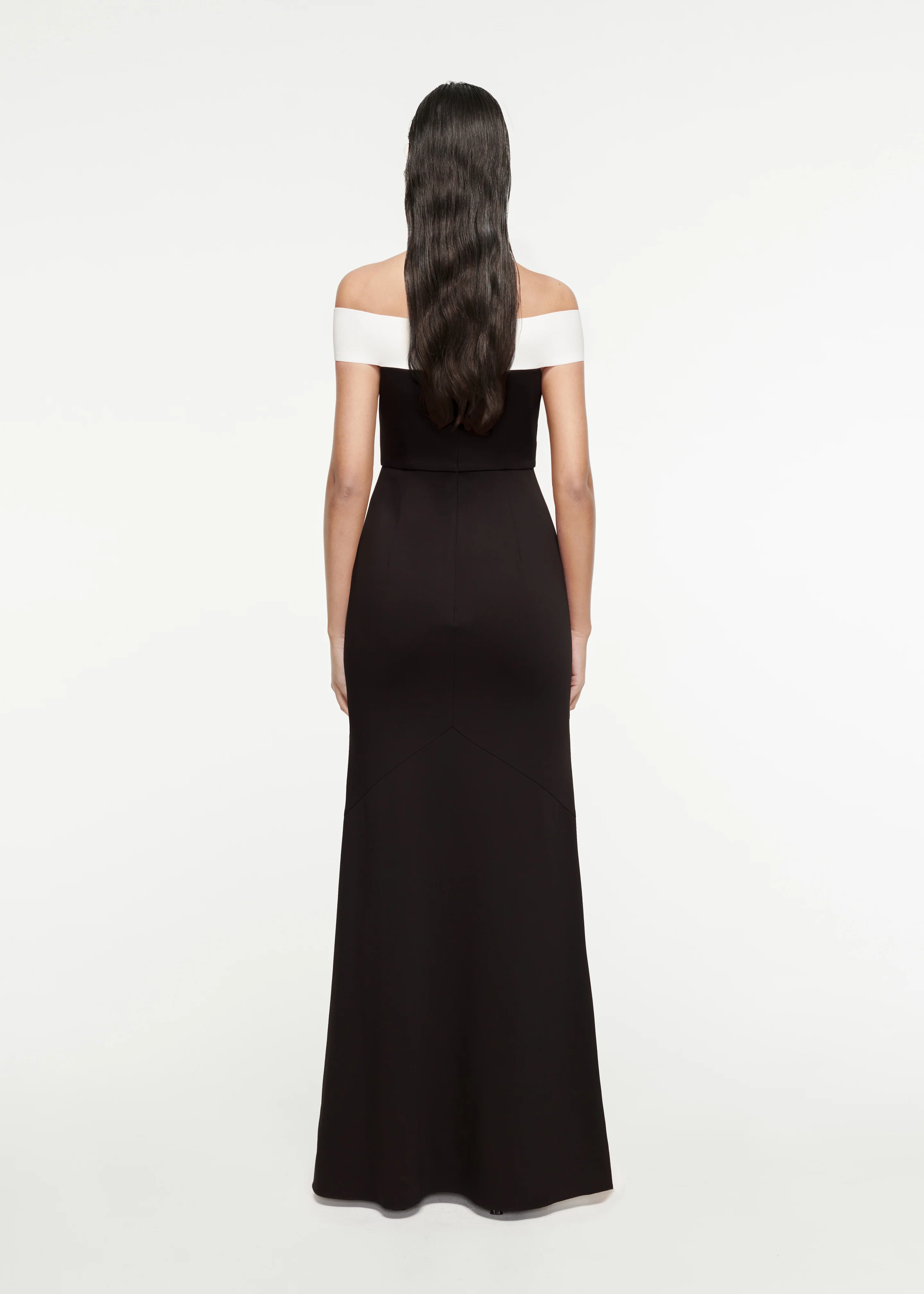 Strapless stretch-cady floor-length gown in black featuring a fluted hem. This gown has stretch and a concealed zip fastening at the back.