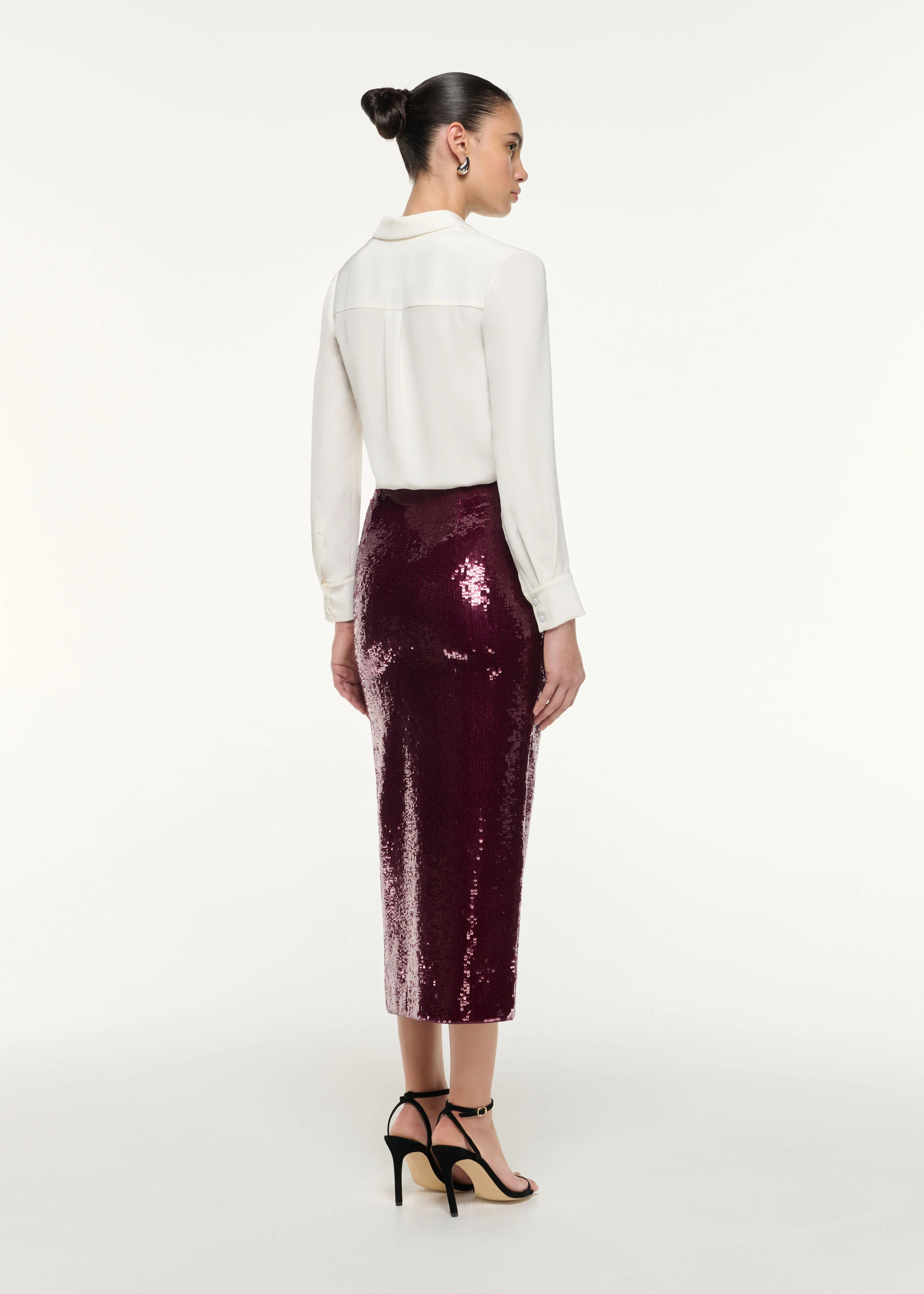 Slim fitted midi skirt in all-over dark pink sequin fabric. With a slit at one side and simple silhouette, it's a versatile skirt that can be styled for parties or casual day wear.