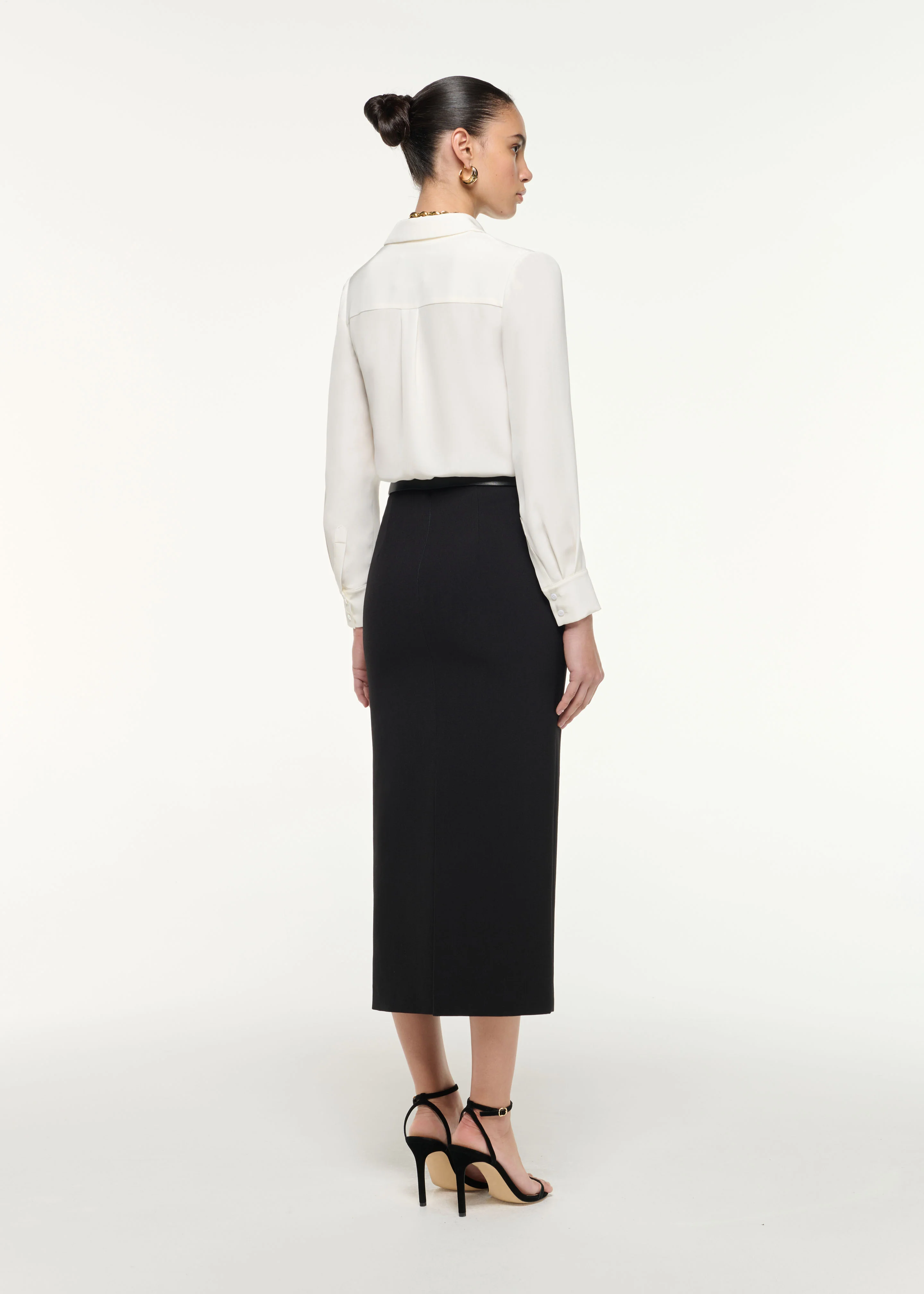 Shirt style bodysuit in white silk fabric. Collar with lapel and fastened with faux shell buttons at the front and cuffs. Gusset is in stretch jersey with poppers for comfort and ease. Complete the look with our matching skirt and belt.