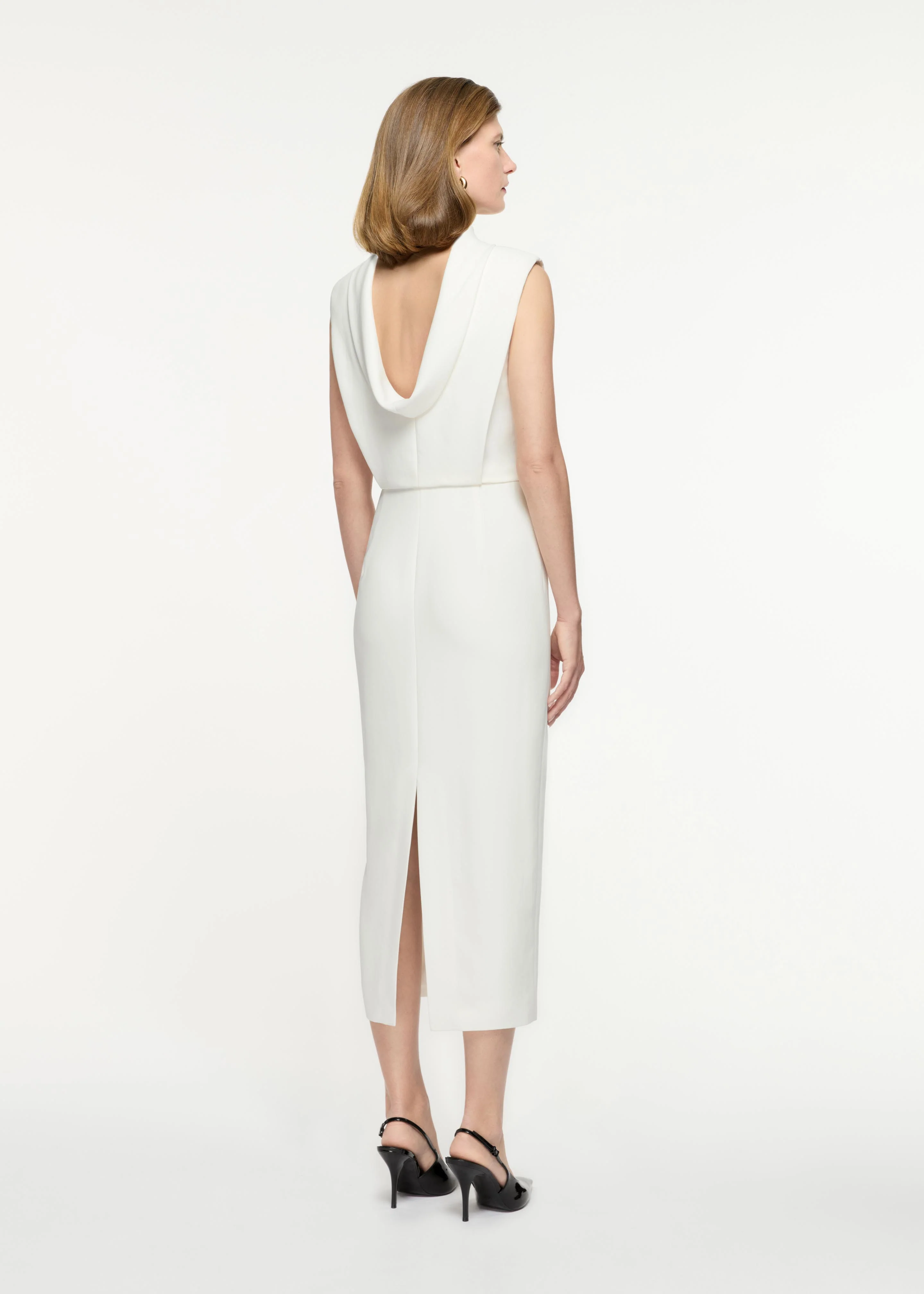 Heavy cady midi dress with stretch falling to mid calf length in white. Featuring a drape detail at the neckline and a scooped back neckline.