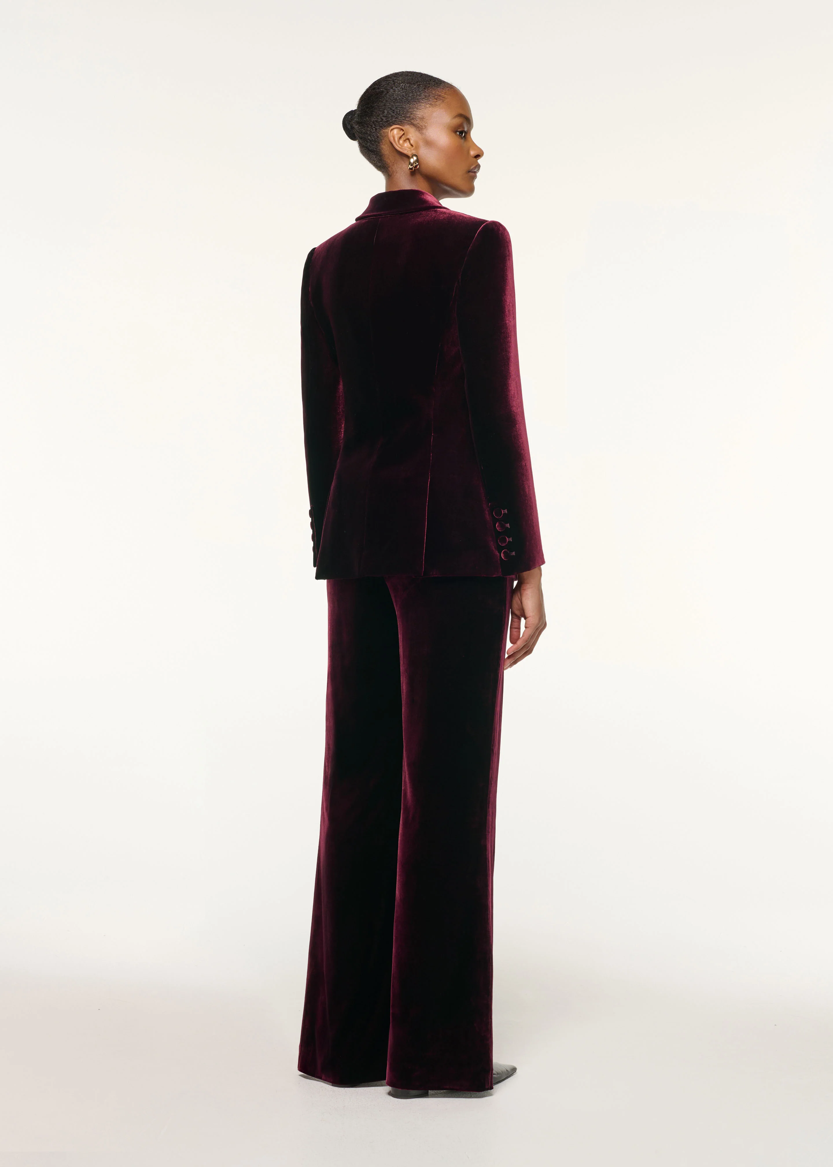 Tailored wide leg trouser finished in a deep mulberry velvet fabric. Matching jacket available.