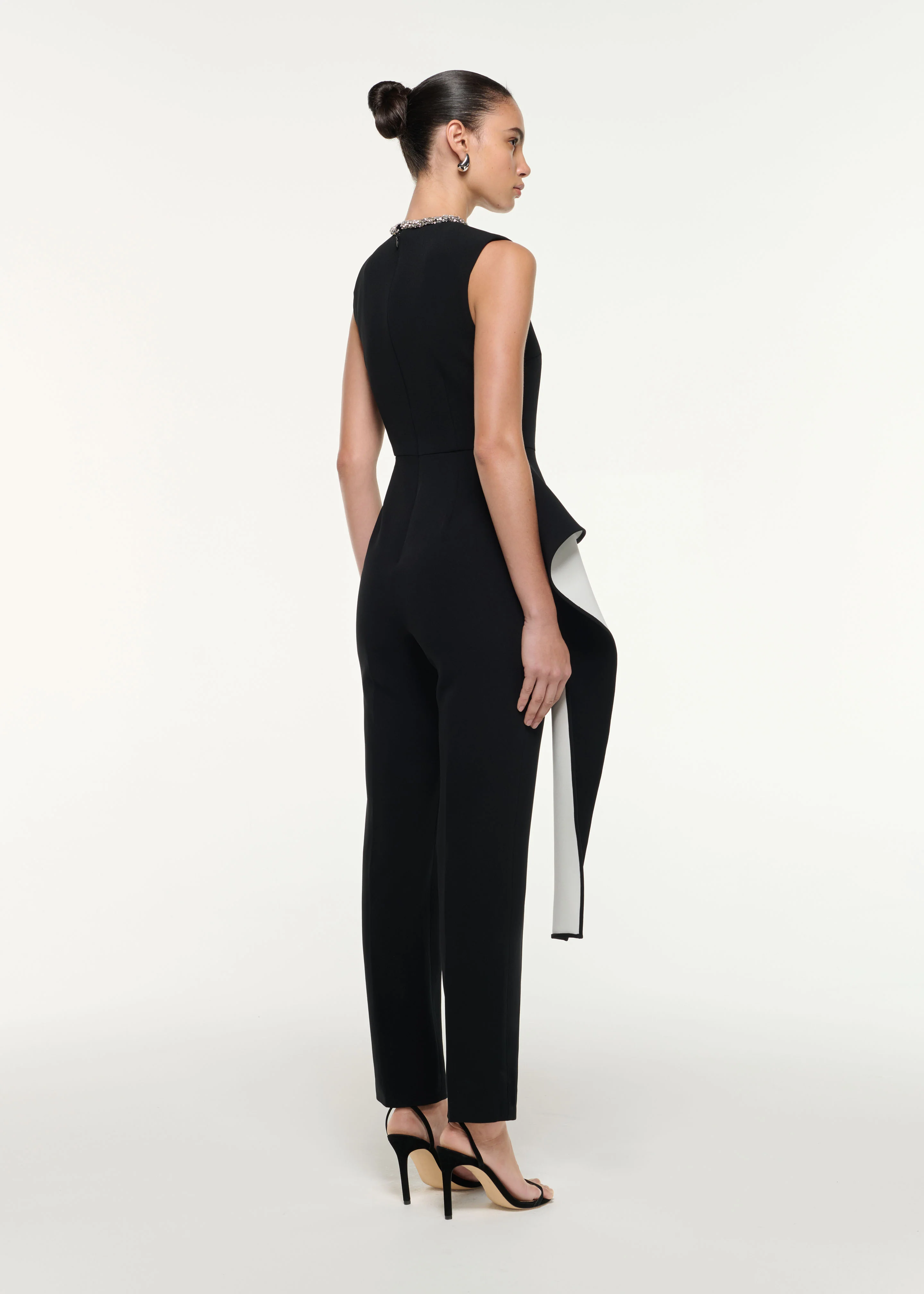 Sleeveless black peplum top jumpsuit in satin crepe. With diamante embellished neckline and drape at waist that wraps around with contrast white reverse side.