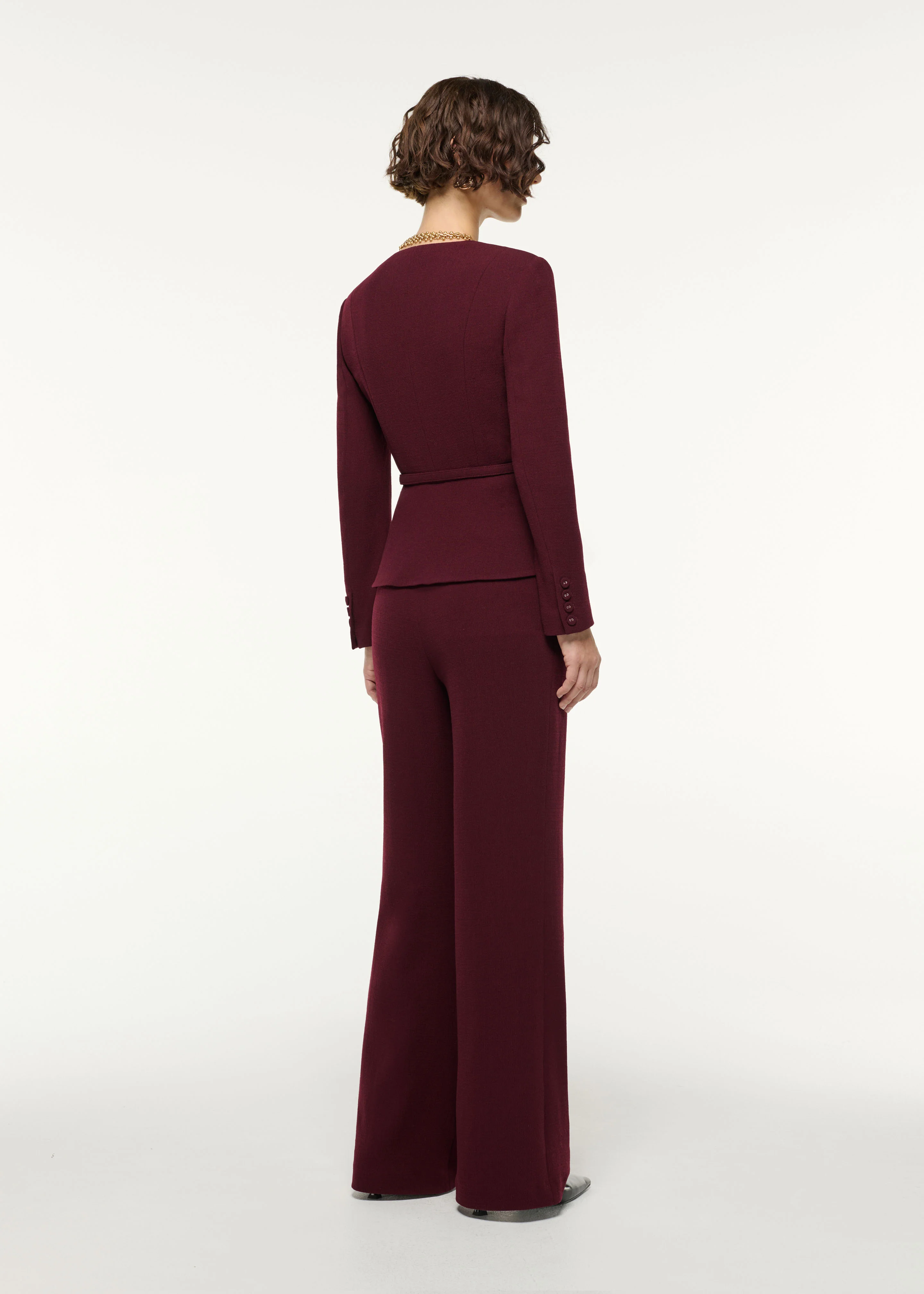 Origami draped peplum on a structured jacket shape. Finished with a matching belt in a deep mulberry colour. Matching trouser available.